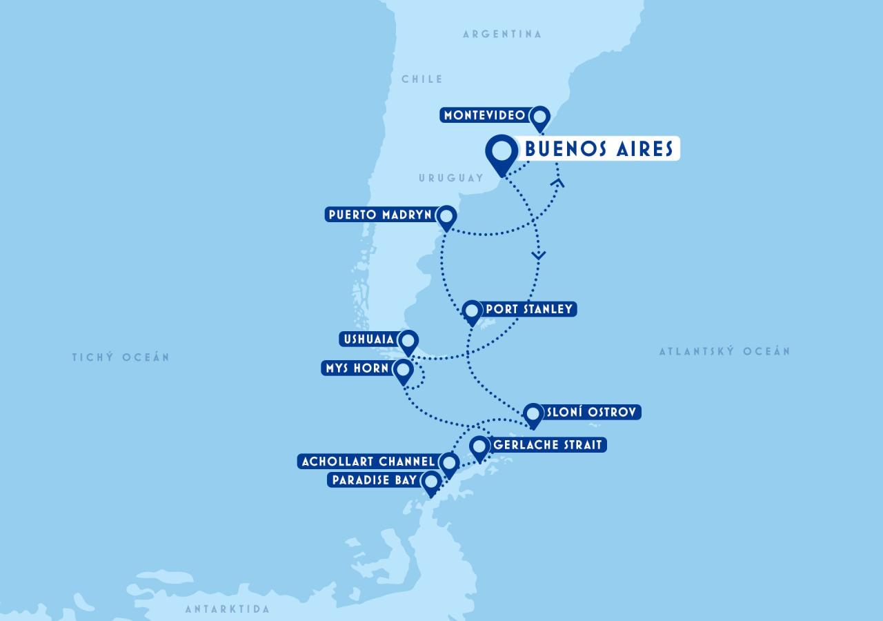 Buenos Aires - Ushuaia - Plavba Mysem Horn - Gerlache Strait, Paradise Bay, Achollart Channel - Port Stanley - Puerto Madryn - Montevideo - Buenos Aires |