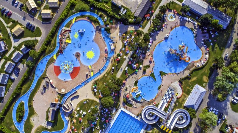 rozkládá na více než 6 500 m² a je zde několik bazénů a vodních